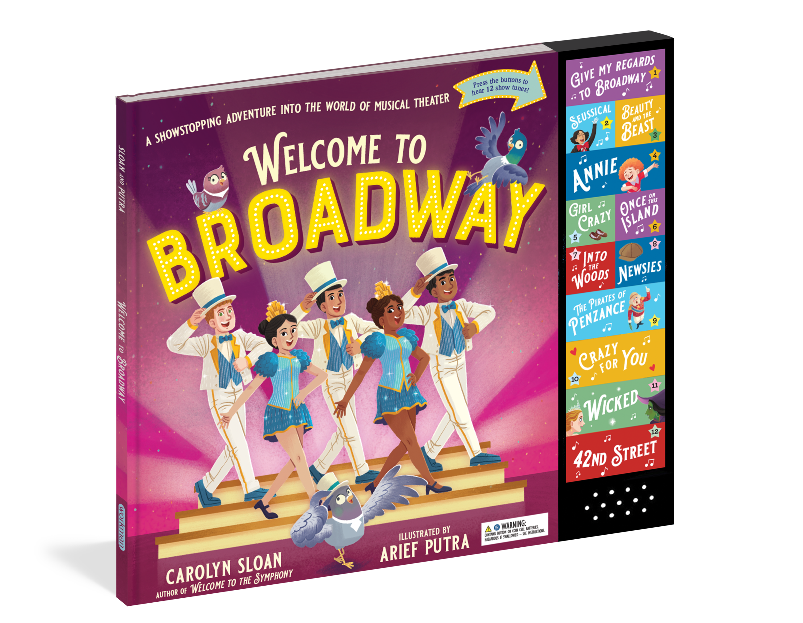 Embark on a dazzling adventure through New York City’s theater district, and the shows it’s famous for, in this illustrated introduction to Broadway musicals, for readers ages 4 and up. As you read, press the 12 interactive sound buttons that play iconic show tunes—including “For Good” from Wicked, “Tomorrow” from Annie, “Belle” from Beauty and the Beast, and so many more. You’ll hear the rhythmic steps of a tap dancer, a singer belting a solo, two infamous witches singing a duet, and a chorus performing a showstopping finale.
