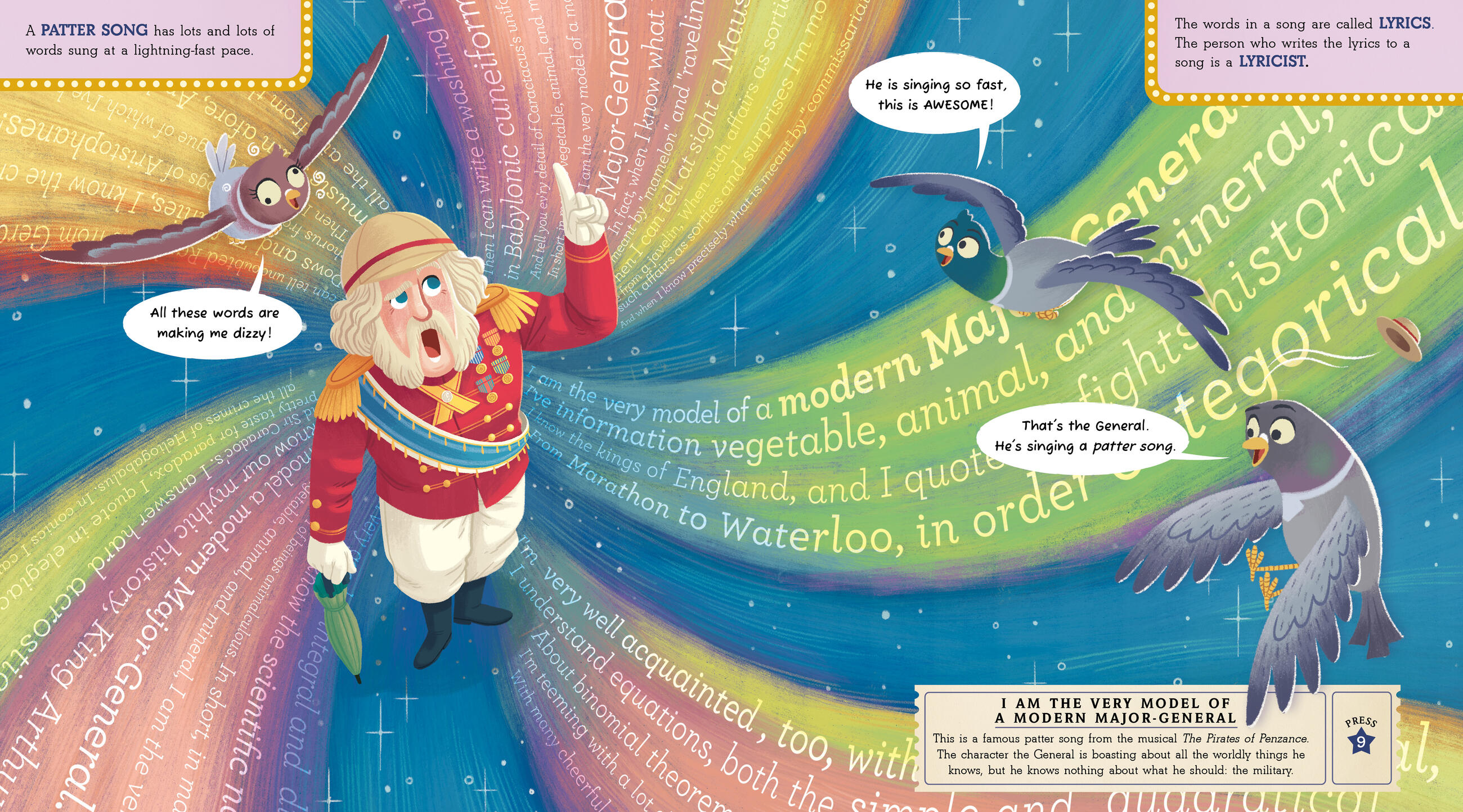 Along the way, you’ll learn about the history of Broadway and all the sensational elements of a Broadway show, from patter songs and ballads to costumes and choreography, with a trio of New York City pigeons as your tour guides. Here’s your ticket. Enjoy the show! (And don’t forget to sing along.)