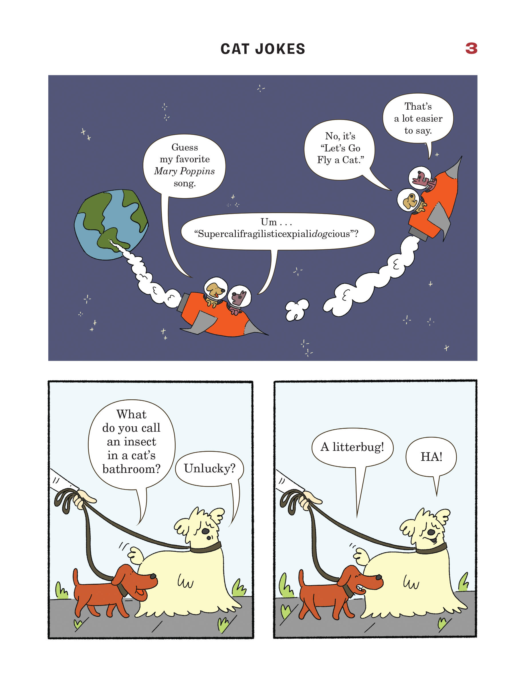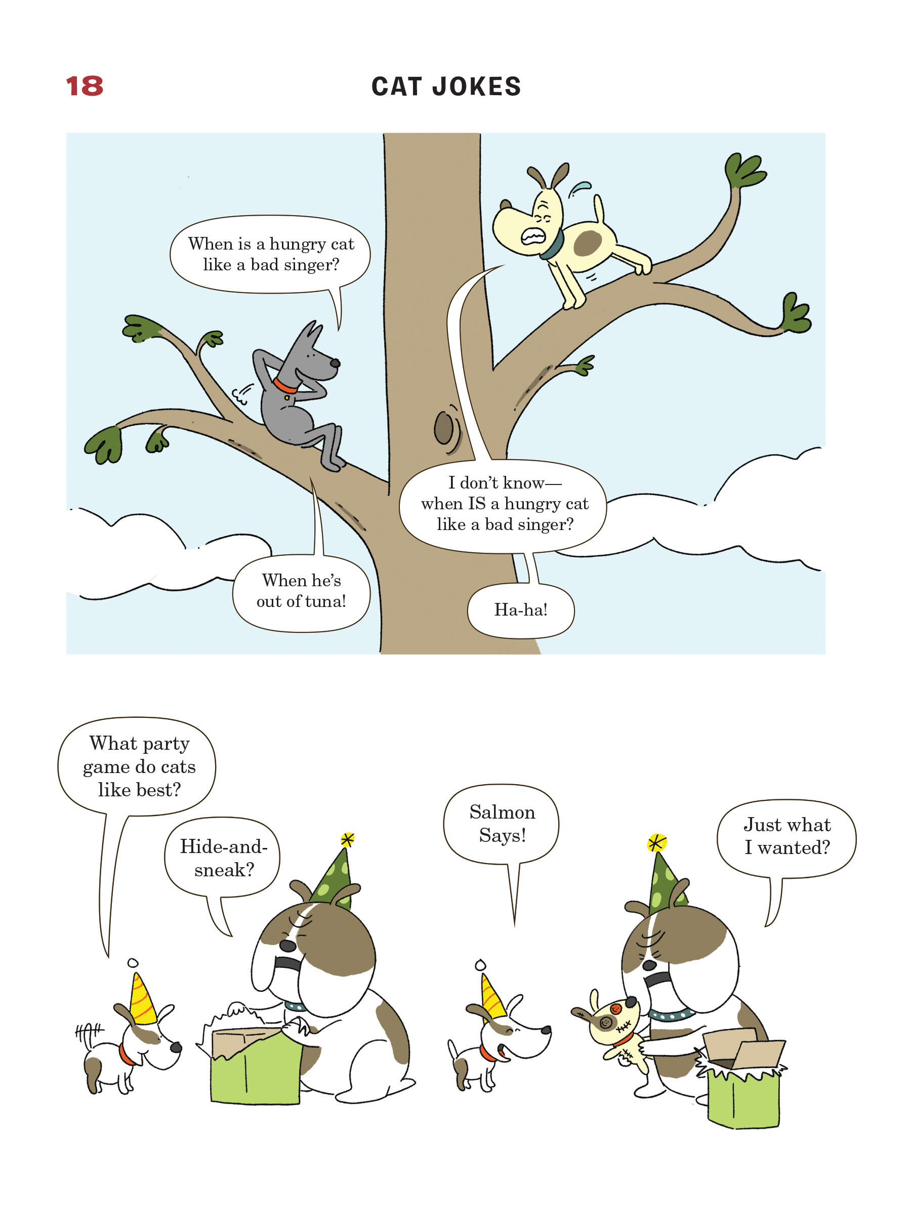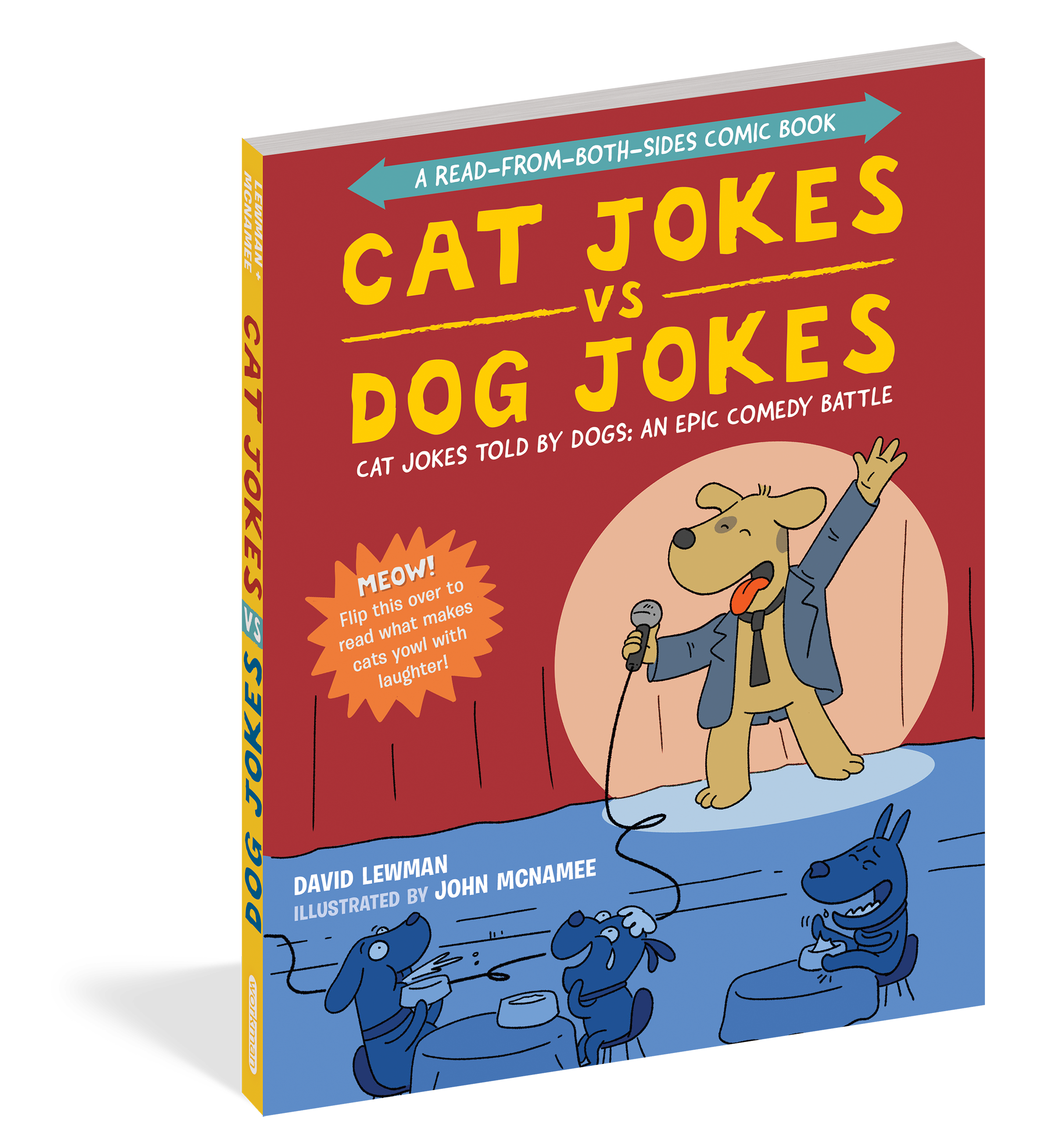 Presented in a read-from-both-sides format, the first half of the book consists of cat jokes told by a recurring cast of dogs (What do you call an insect in a cat’s bathroom? A litterbug!). Flip the book over to start from the other side, and it becomes a book of dog jokes told by cats (What’s the difference between kibble and a heavy mist? One is dog food, and the other is fog, dude!) In the middle spread, the casts of cartoon dogs and cats come together for a mid-book finale of shared giggles, snorts, and guffaws.