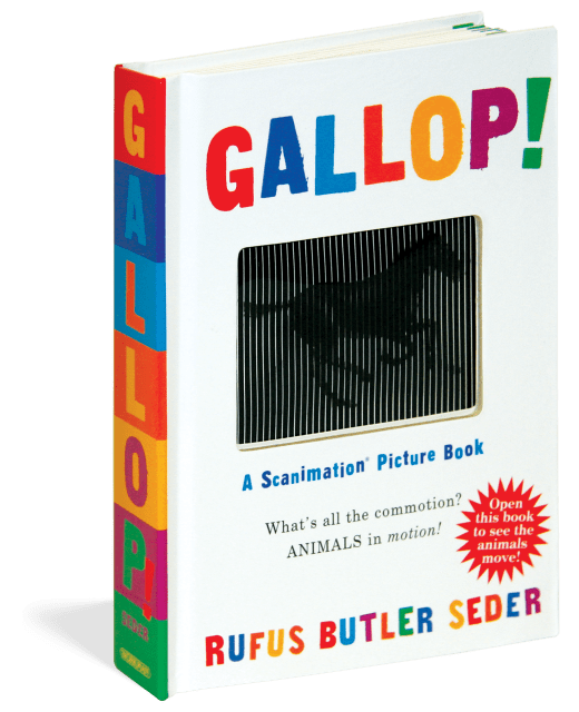 There’s never before been a book like Gallop! Employing a patented new technology called Scanimation, each page is a marvel that brings animals, along with one shining star, to life with art that literally moves. It’s impossible not to flip the page, and flip it again, and again, and again.