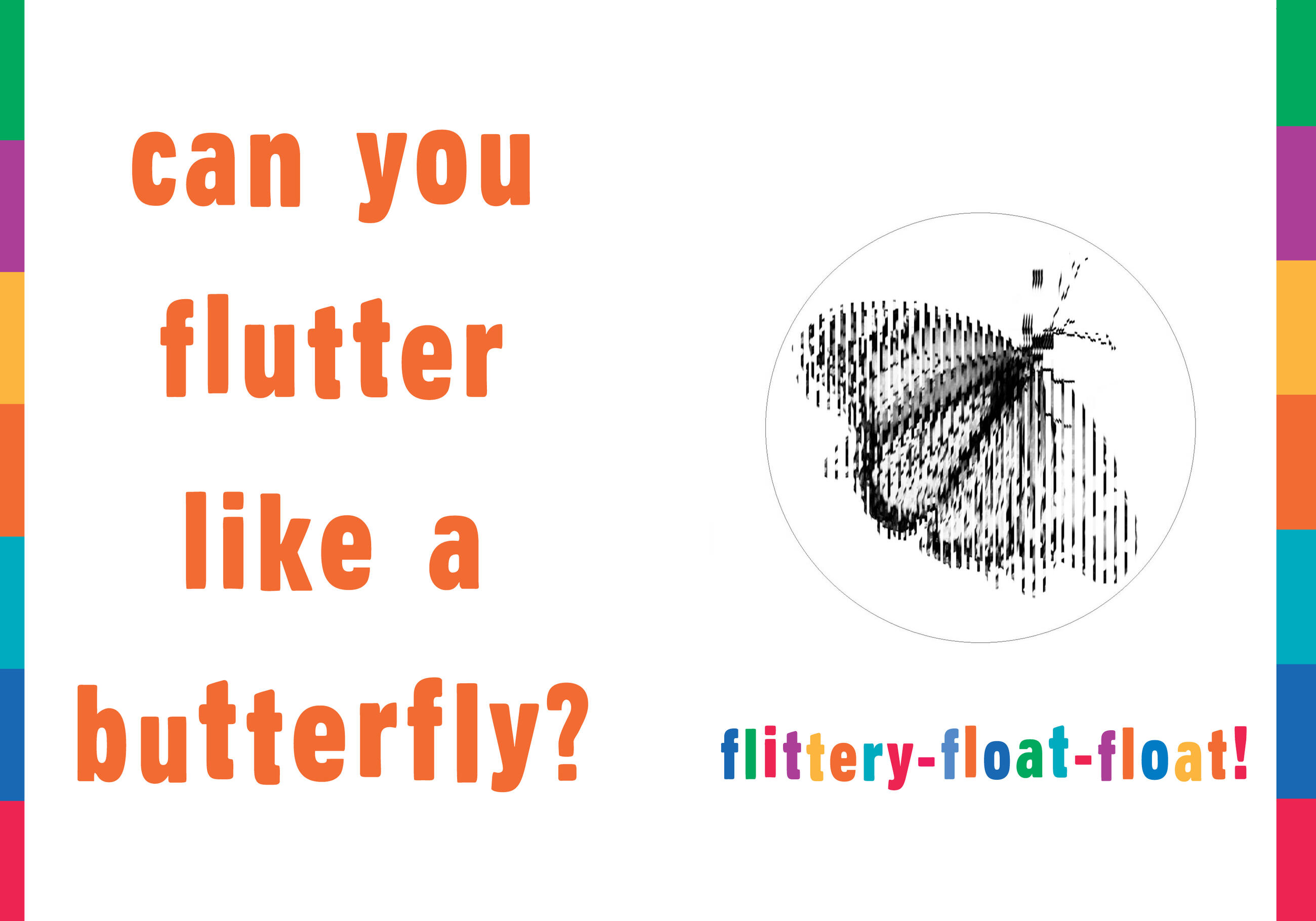 A first book of motion for kids, it shows a horse in full gallop and a turtle swimming up the page. A dog runs, a cat springs, an eagle soars, and a butterfly flutters. Created by Rufus Butler Seder, an inventor, artist, and filmmaker fascinated by antique optical toys, Scanimation is a state-of-the-art six-phase animation process that combines the “persistence of vision” principle with a striped acetate overlay to give the illusion of movement. It harkens back to the old magical days of the kinetoscope, and the effect is astonishing, like a Muybridge photo series springing into action—or, in terms kids can relate to, like a video without a screen. Complementing the art is a delightful rhyming text full of simple questions and fun, nonsense replies: Can you gallop like a horse? giddyup-a-loo! Can you strut like a rooster? cock-a-doodle-doo!