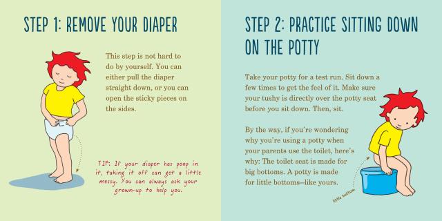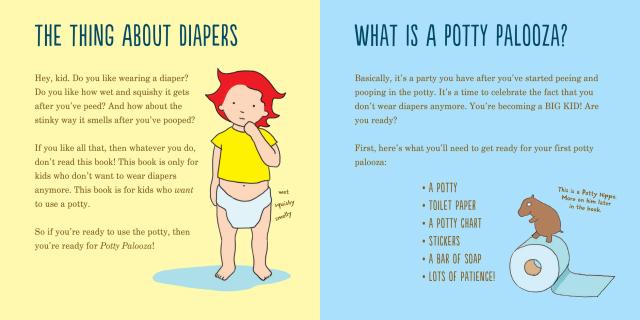 Written from the perspective of an eager and curious toddler (and, unlike other potty-training books, designed to teach both boys and girls), this charmingly illustrated book celebrates every successful trip to the bathroom with a “potty palooza” and stars an endearing and quirky cast of characters: potty hippos, who gather when you use too much toilet paper; space aliens, who zoom in to try to use your potty; a wild elephant; and the Poop Police, who issue Mom or Dad a ticket for sounding too silly when singing the “Potty Song.”