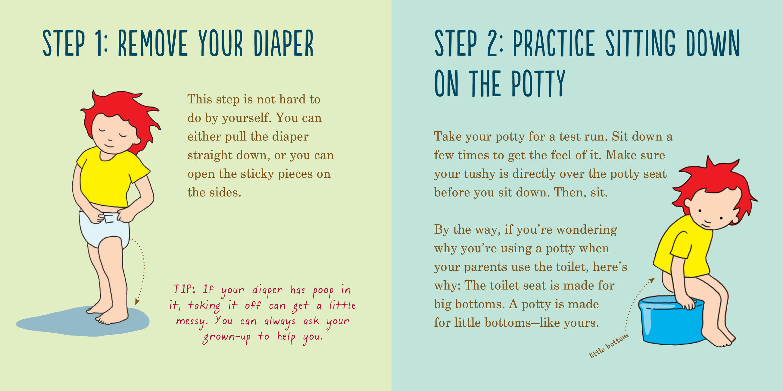 Toddlers will giggle as they learn the answers to all their questions: Will I fall in? (No, you’re way too big.) How often will I be using the potty? (As often as you feel like you need to poop or pee.) Is it true that everyone poops, even the president of the United States? (Yes, everyone poops!)