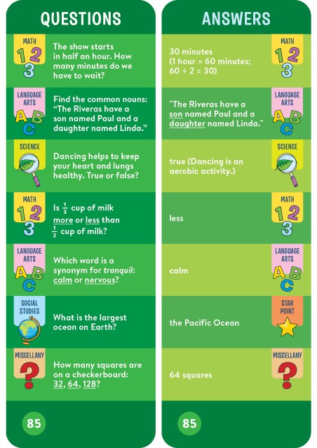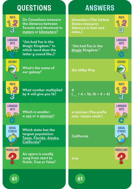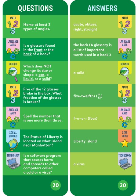 "The look has been modernized and the material has been updated since you were a kid — it’s based on school curriculums, with categories for the third-grade set including math, science, social studies, and language arts. But in this form, the quizzing doesn’t feel like school; it becomes a game that can be played anywhere, including in a car or on a plane."