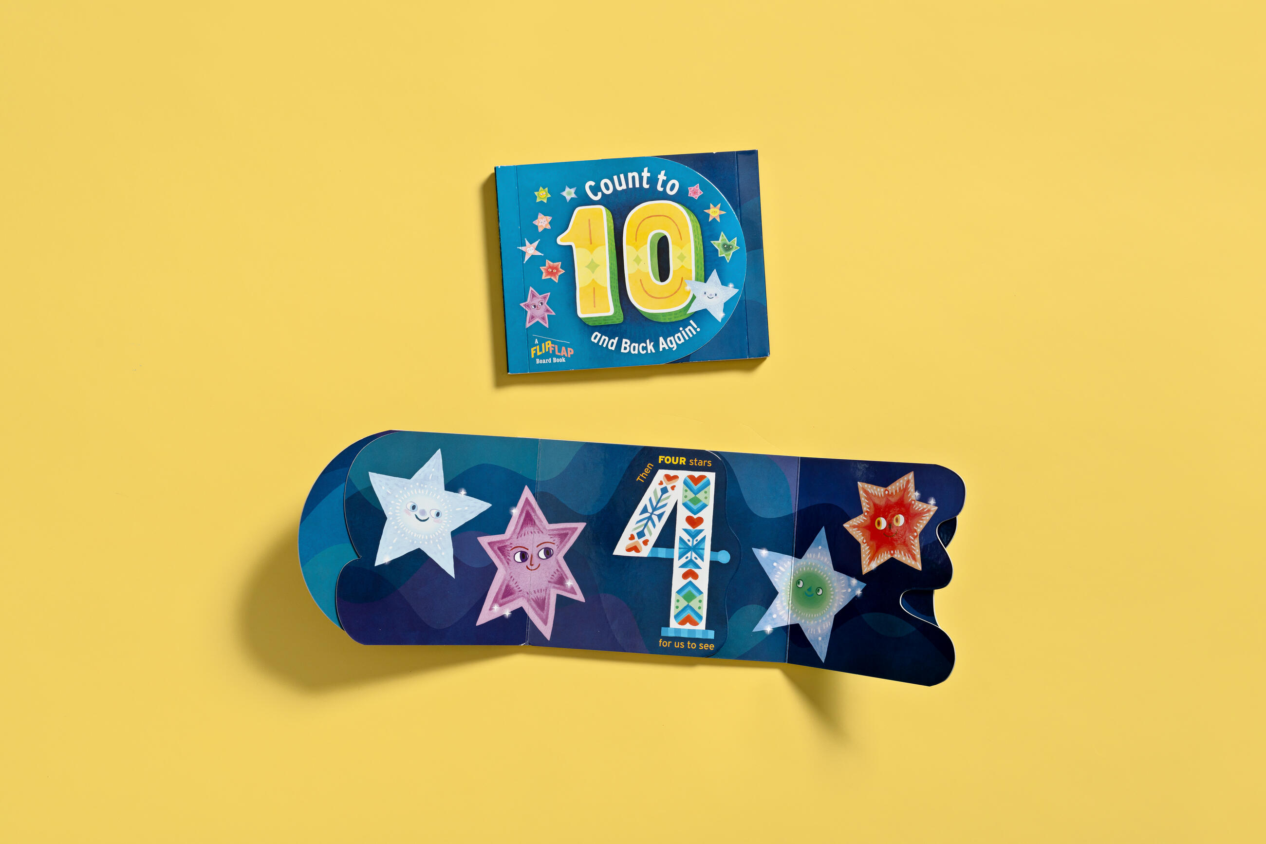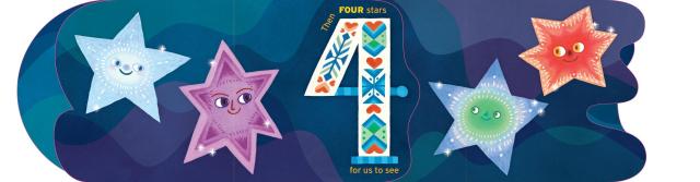 This board book has two spines—one on each side—so that the book opens outward left and right. Plus, each page is shaped like a number from 1 to 10! As new stars appear in the darkening night sky, count them along with the rhyming text: